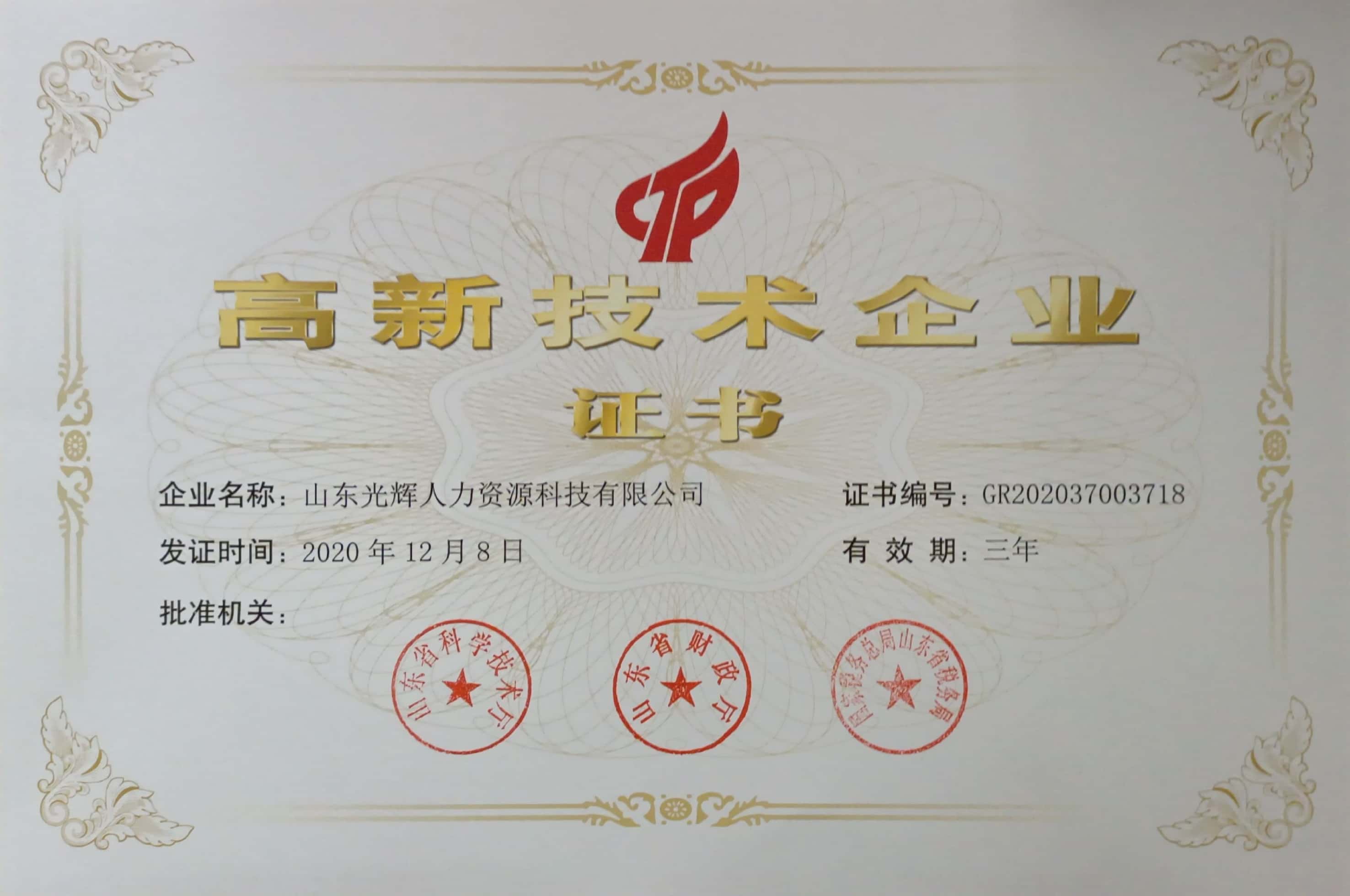 【喜報】山東光輝人力資源科技有限公司通過高企認(rèn)定